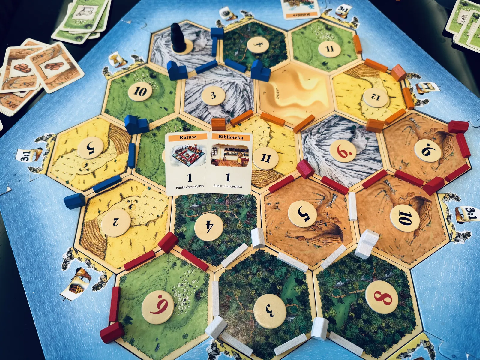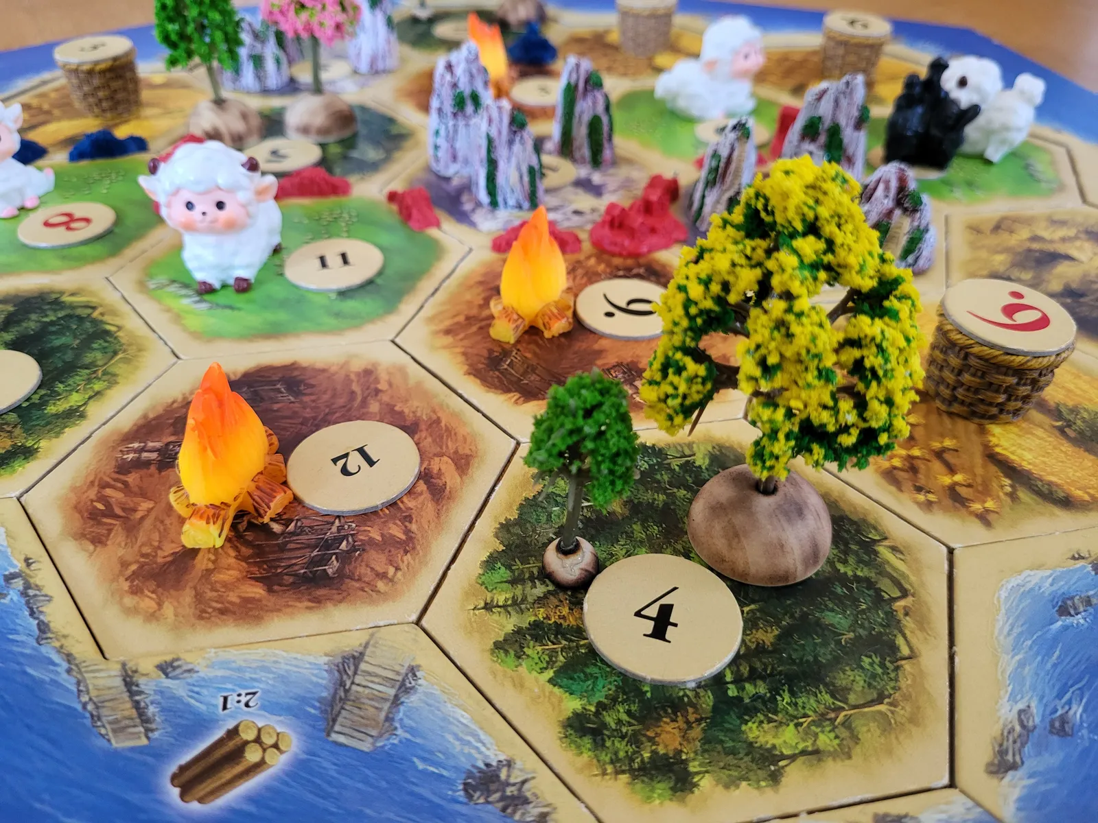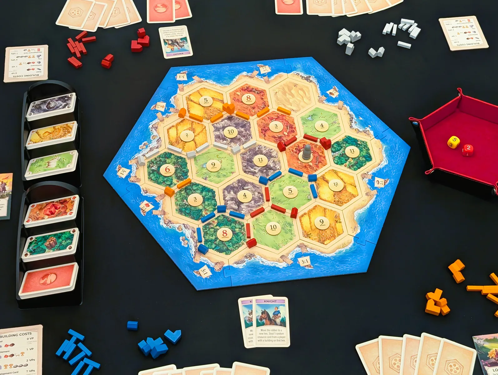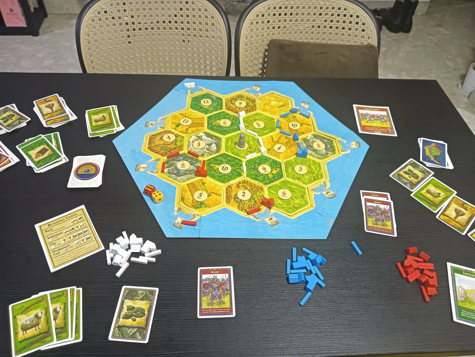 La preparación consiste en colocar al azar grandes fichas hexagonales (cada una representando uno de los cinco tipos de terreno productores de recursos, o el desierto) en forma de panal y rodearlas con fichas de agua, algunas de las cuales contienen puertos de intercambio. Se coloca un disco numérico, cuyo valor corresponderá a la tirada de dos dados de 6 caras, sobre cada ficha de terreno. Cada jugador recibe dos asentamientos (casas, por ejemplo) y dos caminos (palos) que se colocan en las intersecciones y los bordes de las fichas de terreno. Los jugadores recolectan una mano de cartas de recursos según las casillas de terreno adyacentes a su último asentamiento. Se coloca una ficha de ladrón en la casilla de desierto.