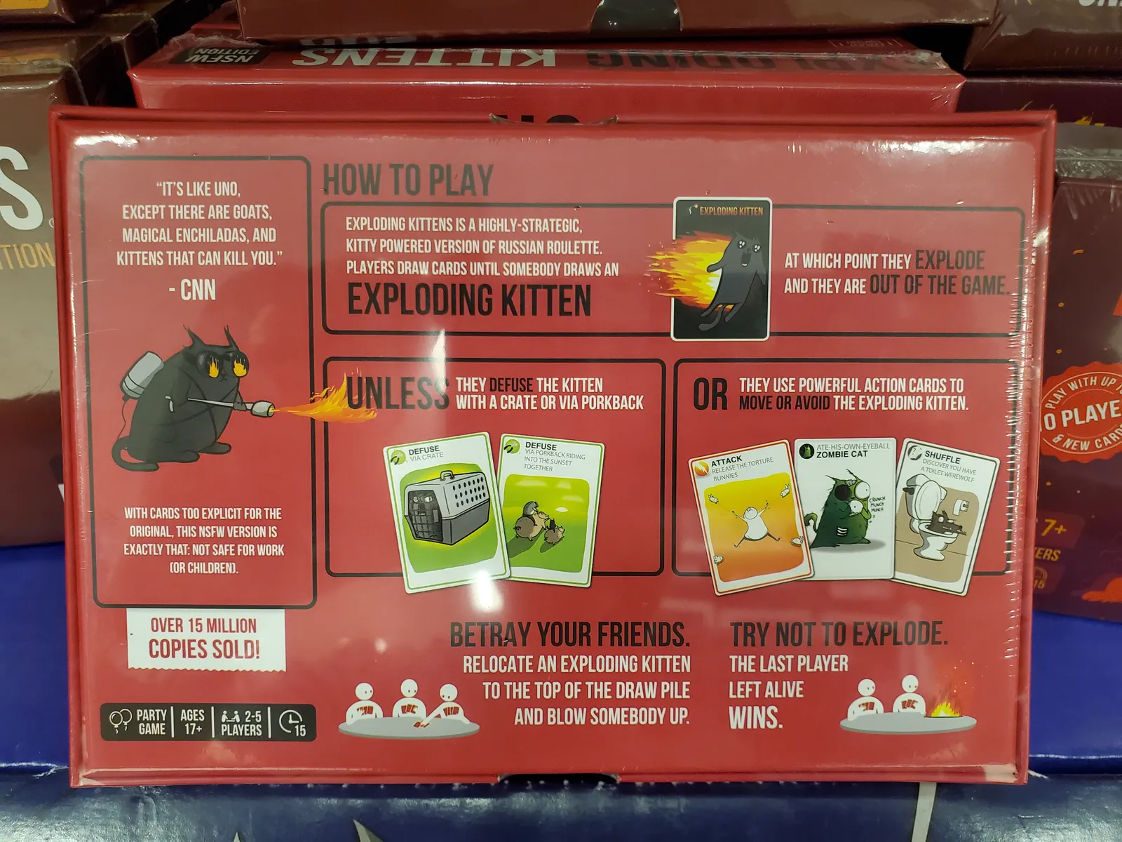 Originalmente una expansión para Exploding Kittens, el proyecto Kickstarter más exitoso de la historia, que contenía cartas demasiado terroríficas o increíbles como para incluirlas en una versión apta para niños. Como objetivo adicional, se convirtió en un juego independiente que puede combinarse con el mazo estándar de Exploding Kittens. Si se combinan ambos mazos, se puede jugar hasta con 9 jugadores. 10 con Imploding Kittens.
