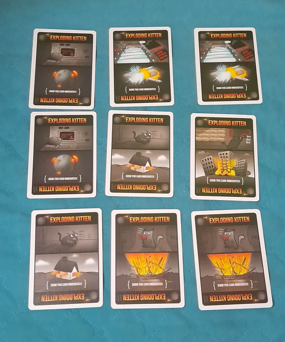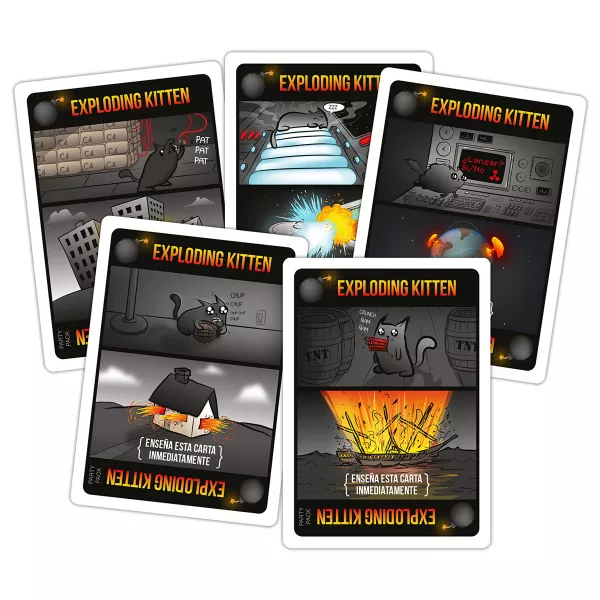 Exploding Kittens es una versión de la Ruleta Rusa con gatitos. Los jugadores se turnan para robar cartas hasta que alguien saca un gatito explosivo y pierde la partida. La baraja está compuesta por cartas que permiten evitar la explosión: puedes echar un vistazo a las cartas antes de robar, obligar a tu oponente a robar varias cartas o barajar la baraja.