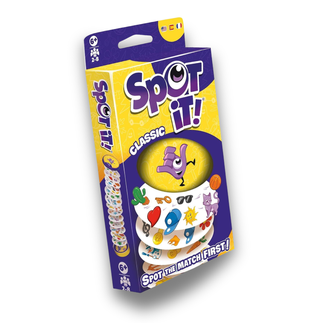 Cada carta del Spot it! original presenta ocho símbolos diferentes, cuyo tamaño varía de una carta a otra. Dos cartas tienen exactamente un símbolo en común. En el juego básico de Spot it!, se revela una carta y luego otra. Quien encuentre el símbolo común en ambas cartas se lleva la primera, luego se revela otra carta para que los jugadores la busquen, y así sucesivamente. ¡Quien haya reunido más cartas cuando se acabe la baraja de 55 cartas, gana!